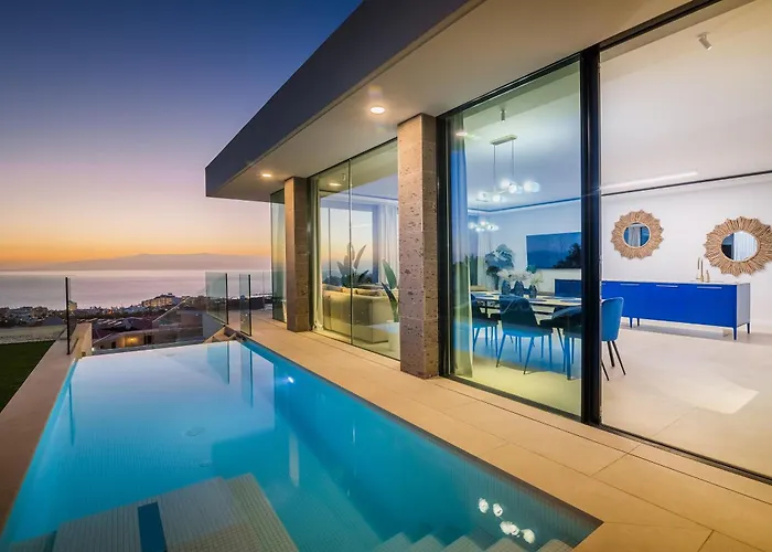 Lux New Villa C With Priv Heated Pool, Ocean View Costa Adeje (Tenerife) располагается приблизительно в 2 км от Плайи дель Дуке и приглашает гостей на террасу. Вилла предлагает гостям расслабиться в глубоководном бассейне.